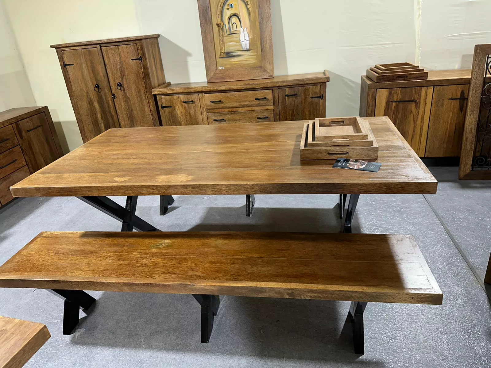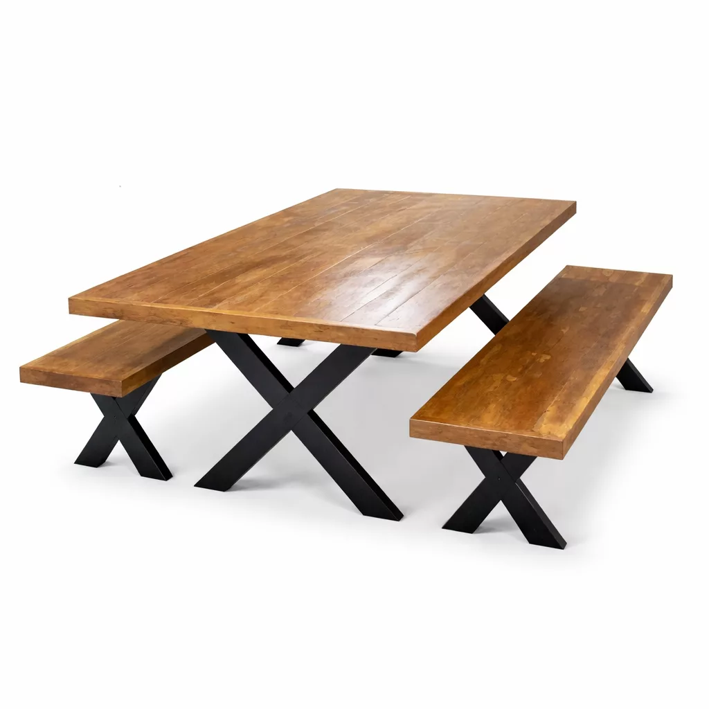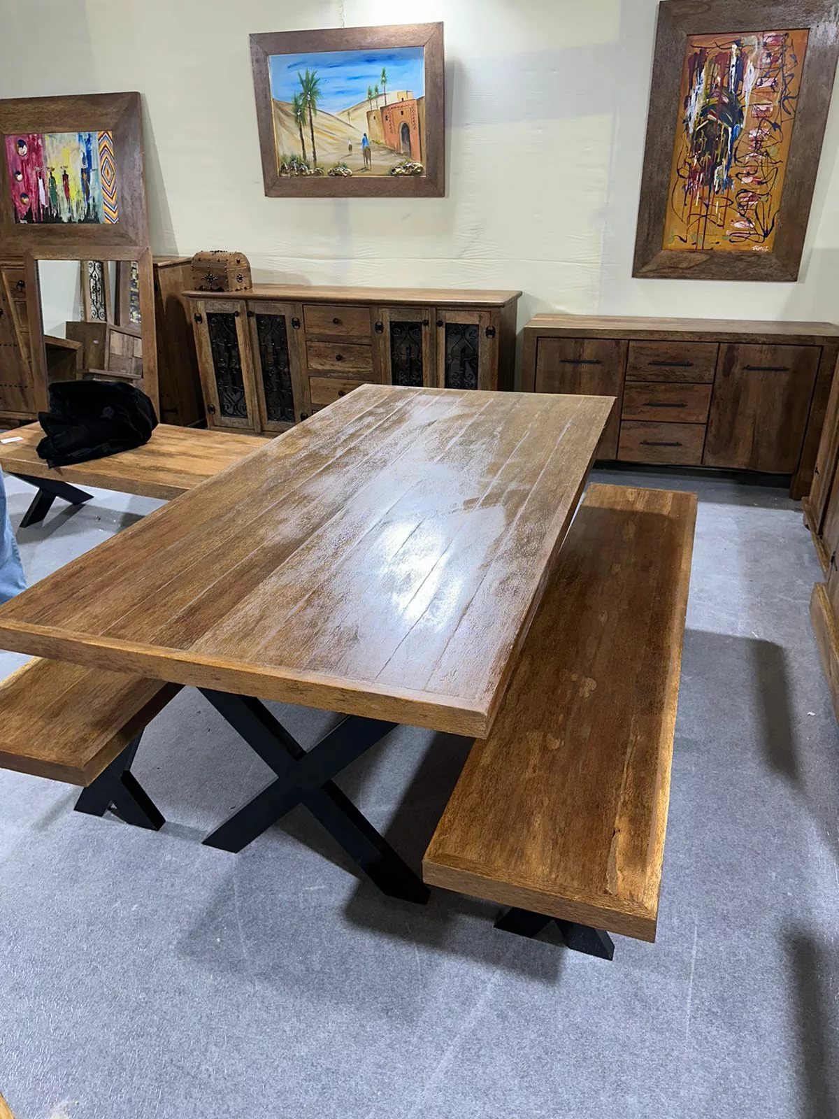 Table à manger industrielle en bois de palmier – Structure métal croisé
