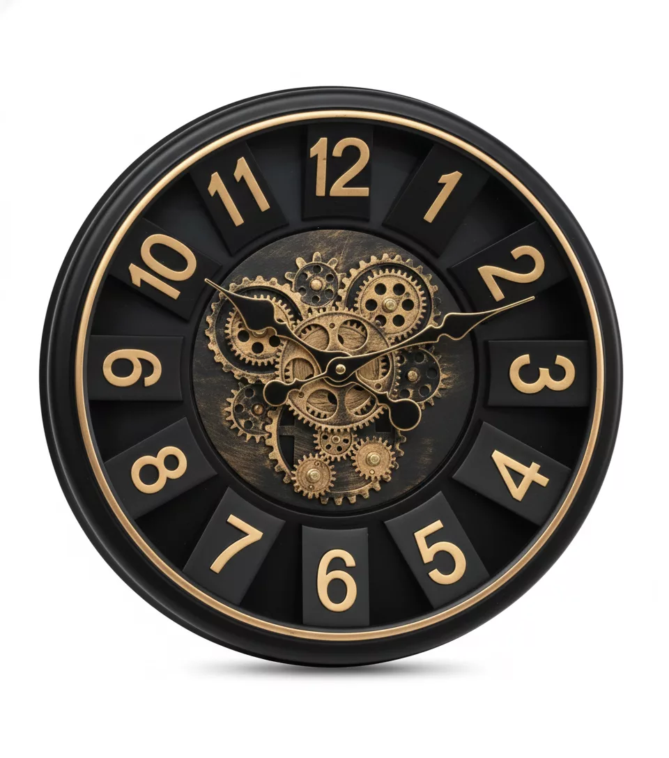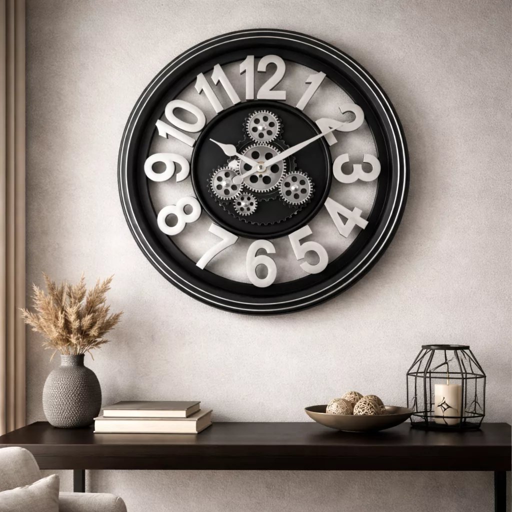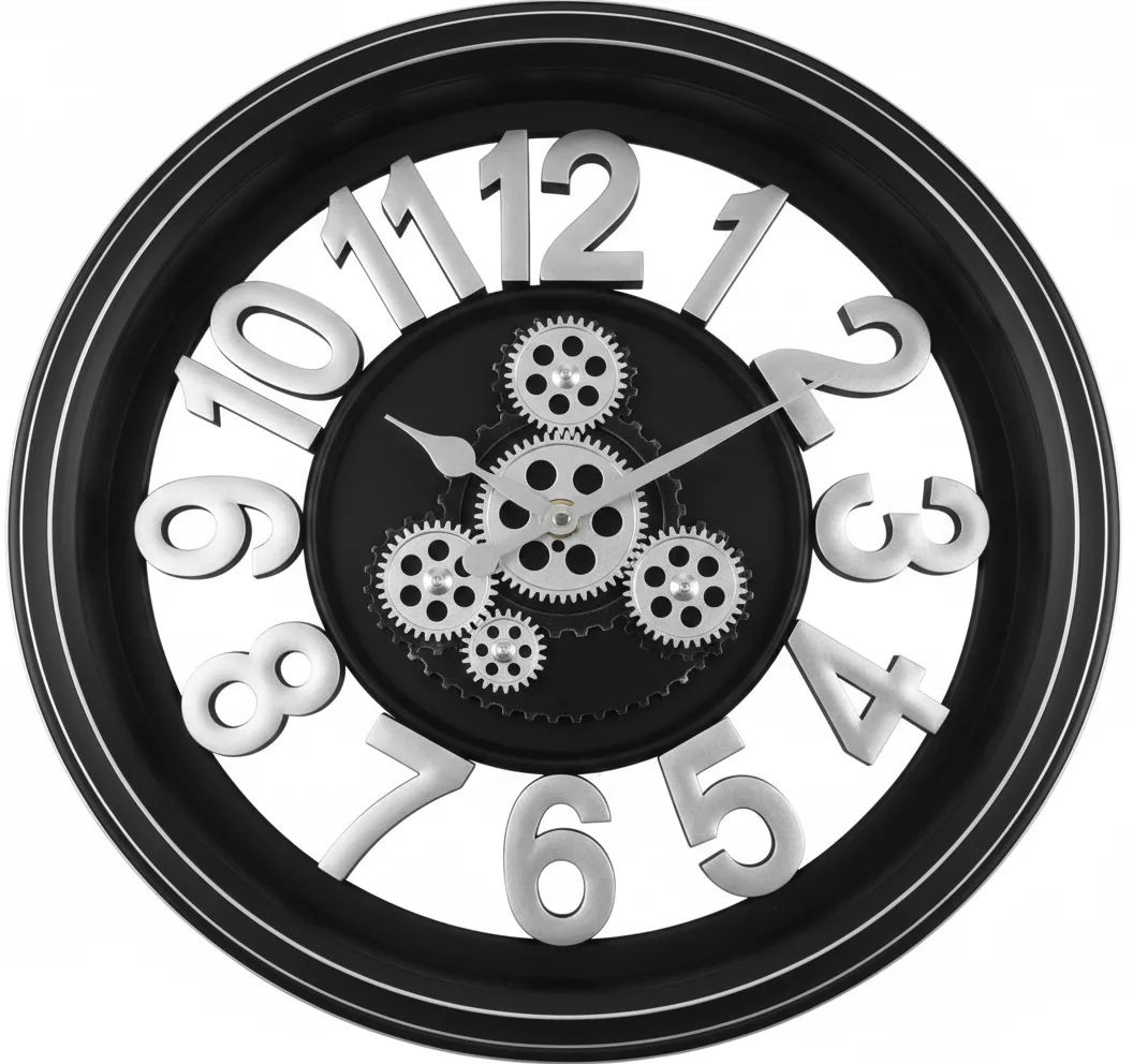 Horloge murale industrielle – Design mécanique noir et argent