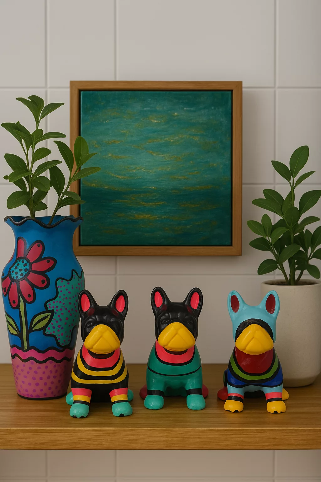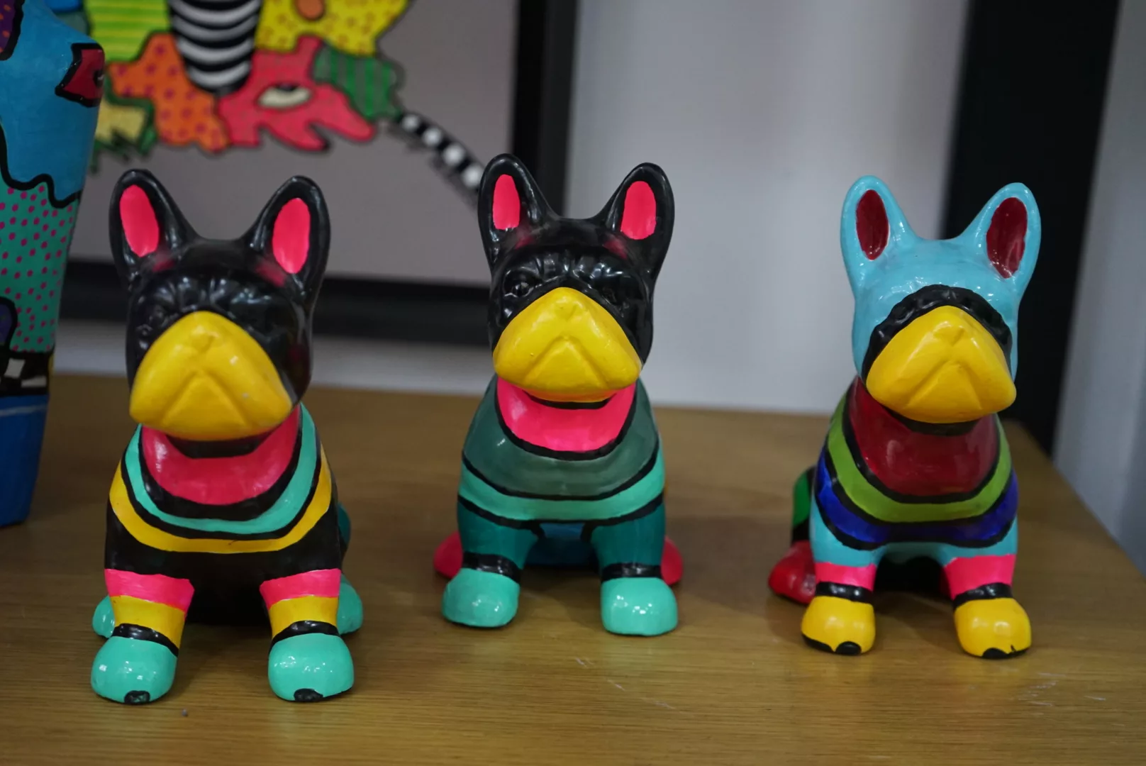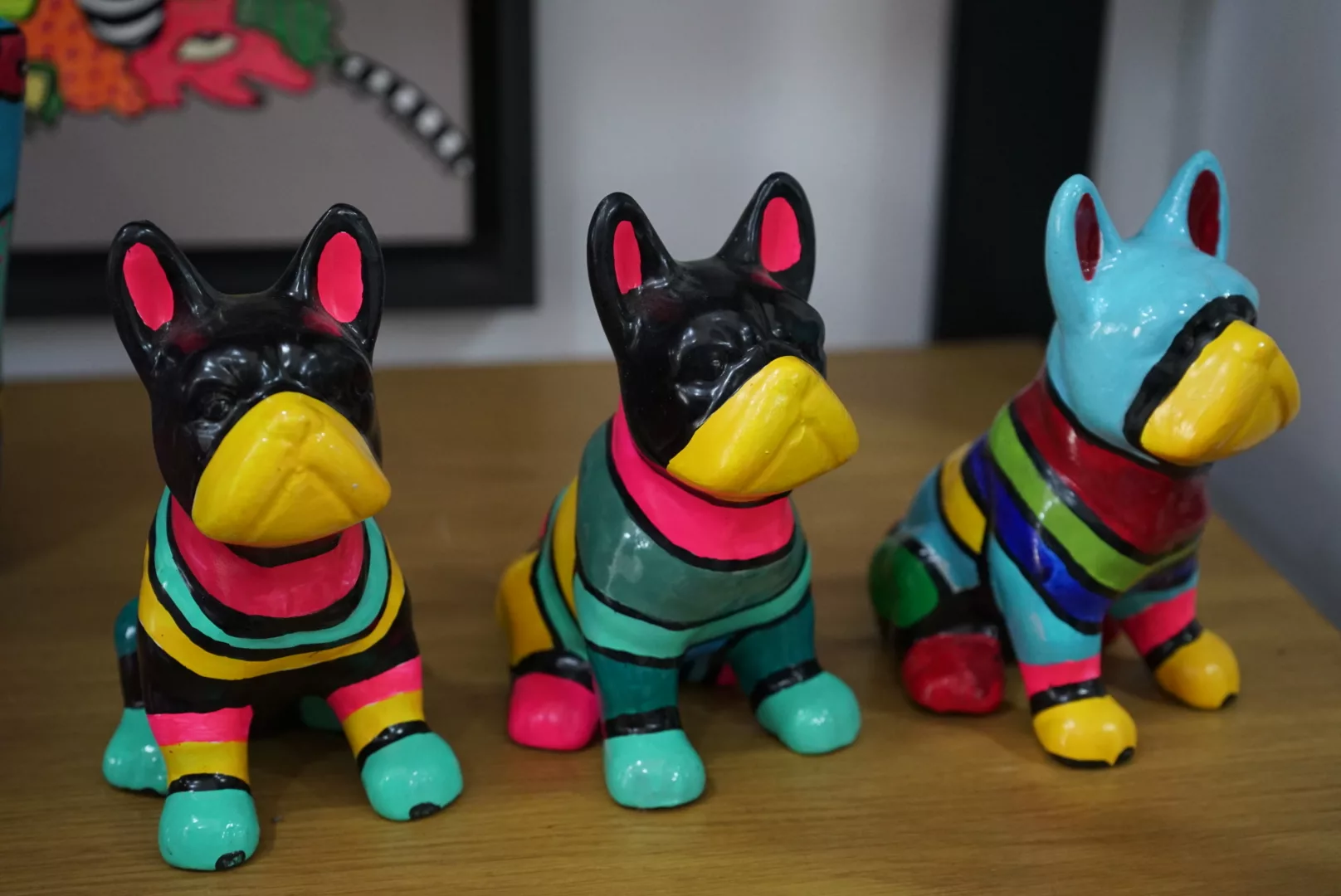 Statuette Bulldog en résine blanc avec éclaboussures multicolores