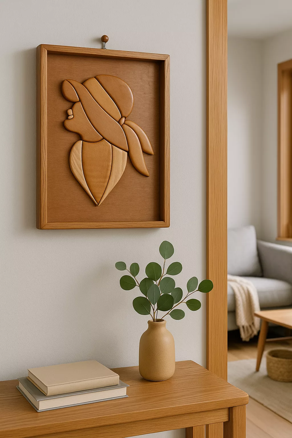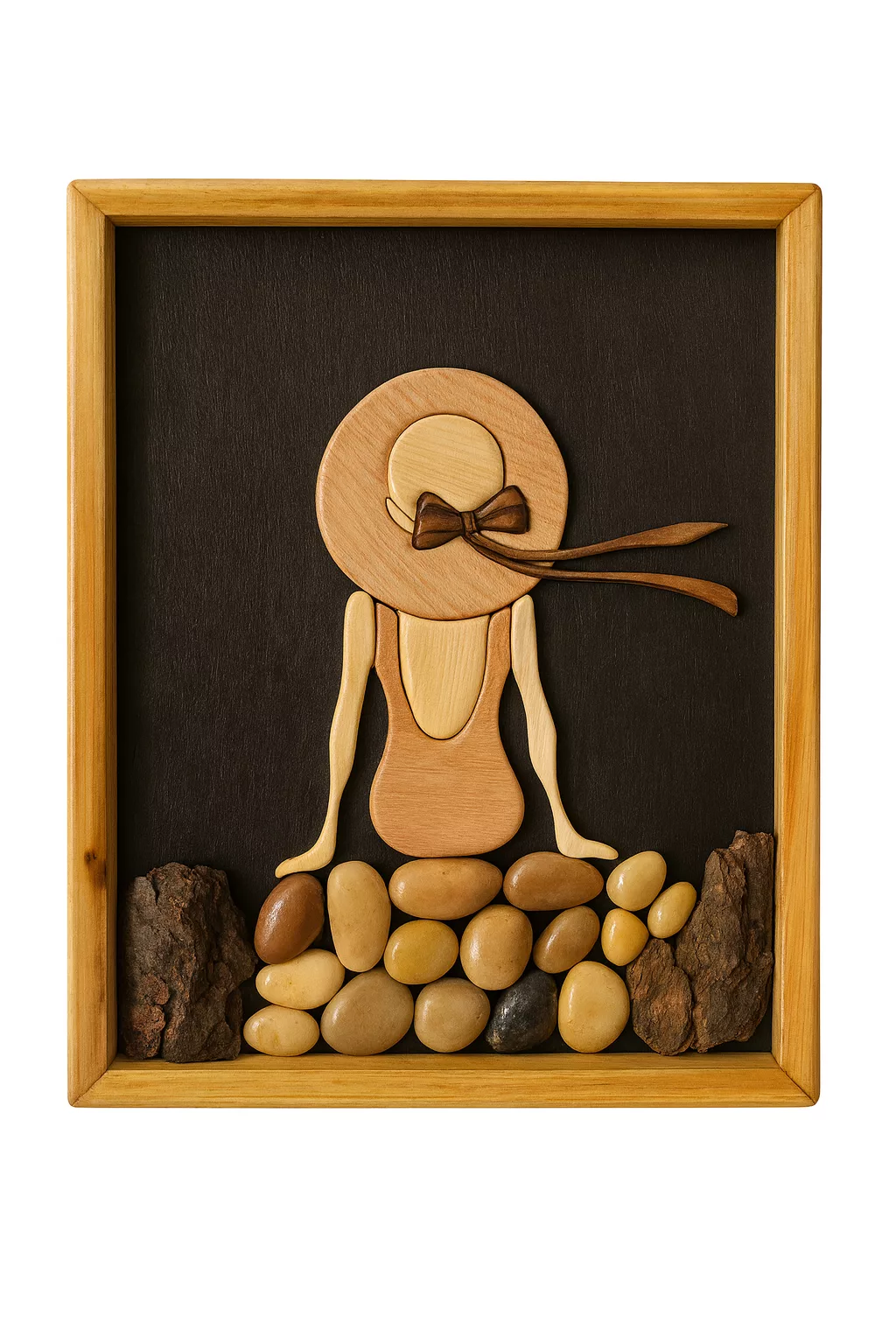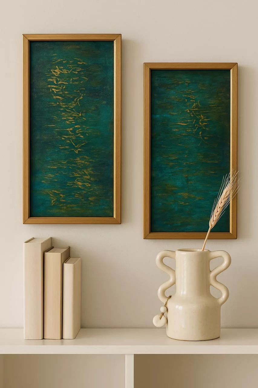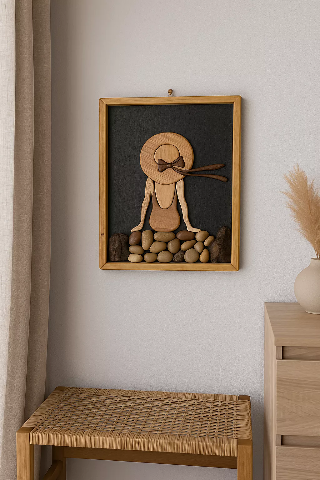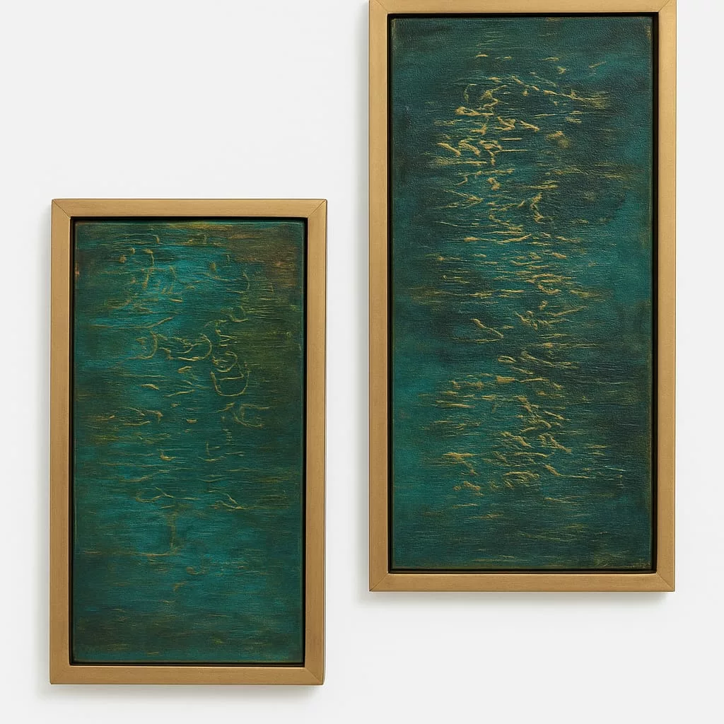 Tableau artistique moderne – Croquis coloré sous verre avec encadrement bois façon caisson américain