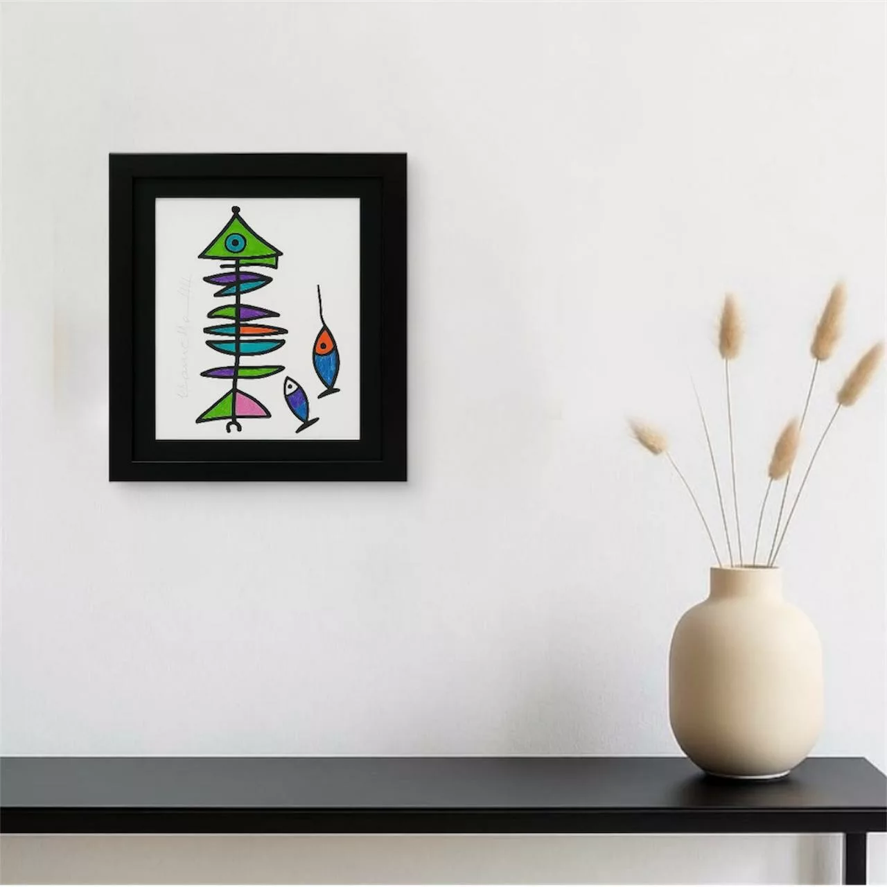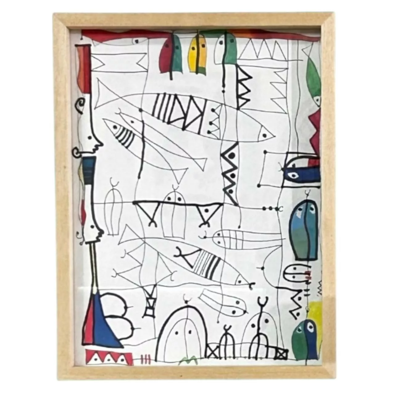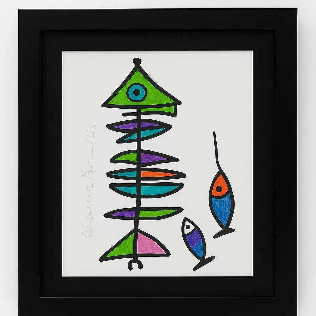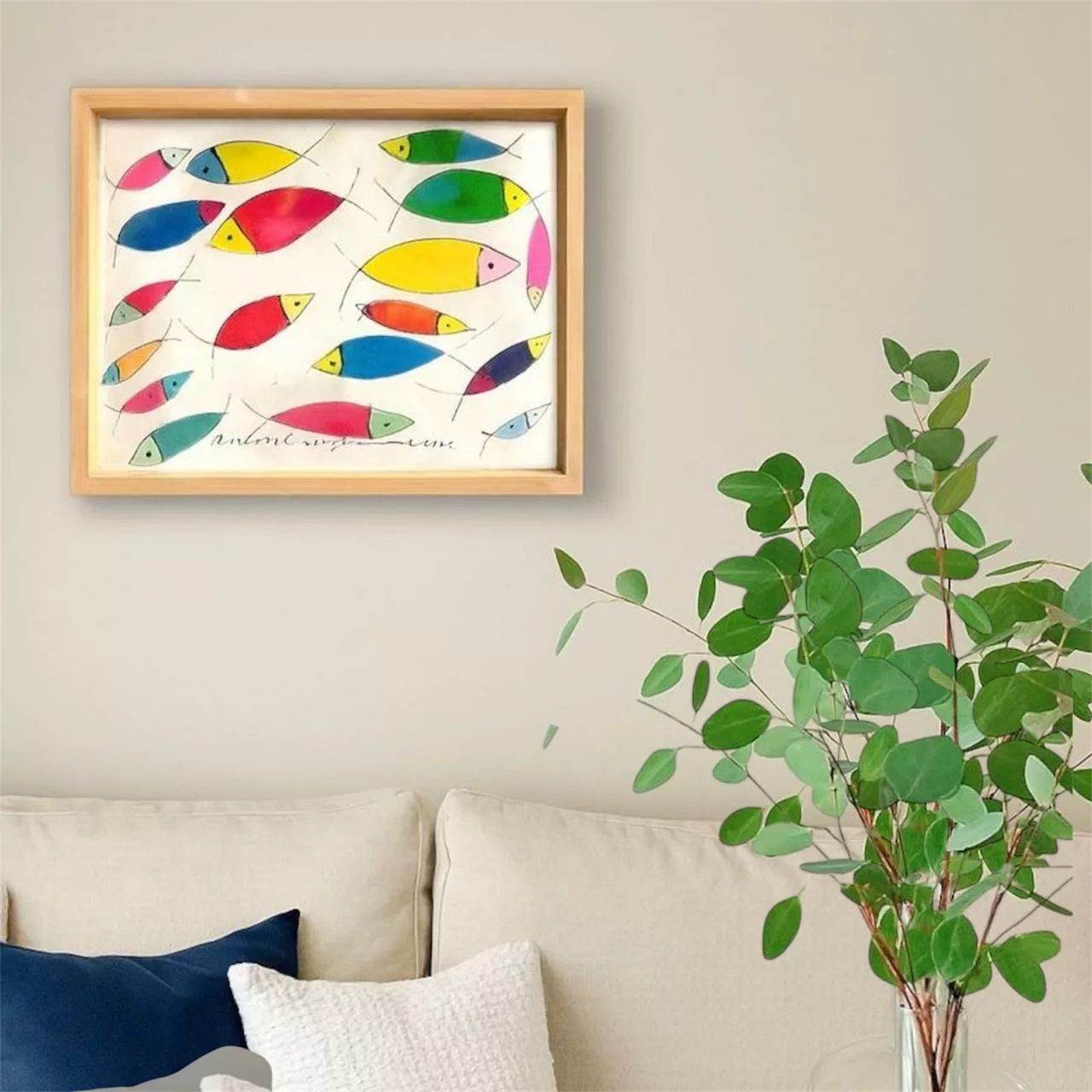 Croquis artistique “Poissons abstraits” – Encadré sous-verre, Caisson bois