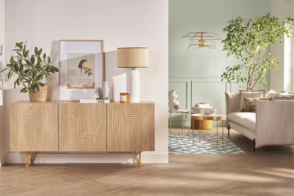 Ensuite, les meubles en bois effet chevron permettent d’intégrer un sens géométrique et ordonné. Ce motif est un classique intemporel qui mêle modernité et tradition. Les motifs en « V » inversé créent un mouvement dynamique à fort caractère. L’effet chevron rappelle le travail artisanal, offrant une surface au meuble unique et surtout agréable au toucher. Un meuble avec de tels motifs sera idéal pour ajouter de la profondeur à une pièce en plus de la chaleur naturelle donnée par le bois.