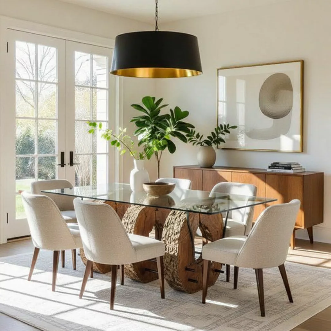 Table Design en Bois Massif & Verre – Piètement Métallique Géométrique