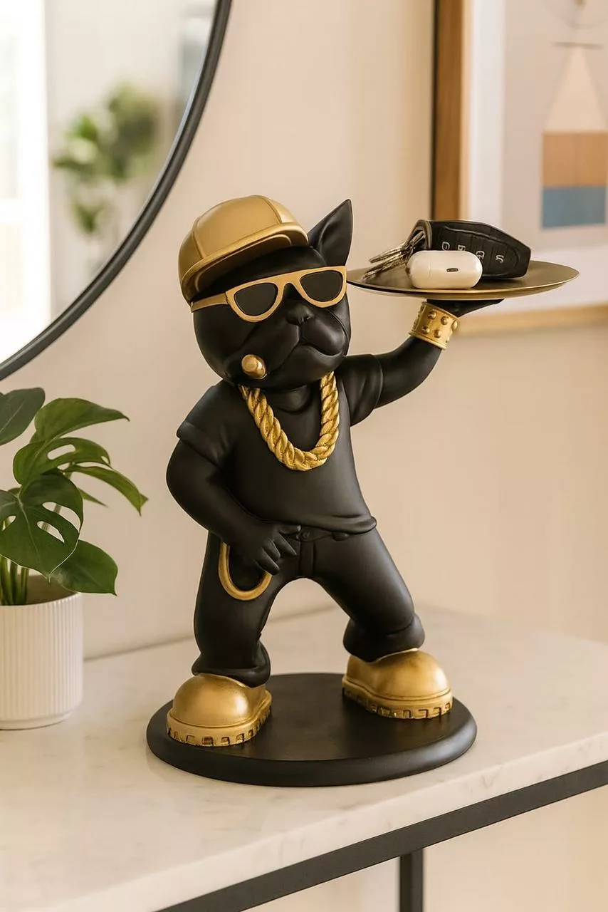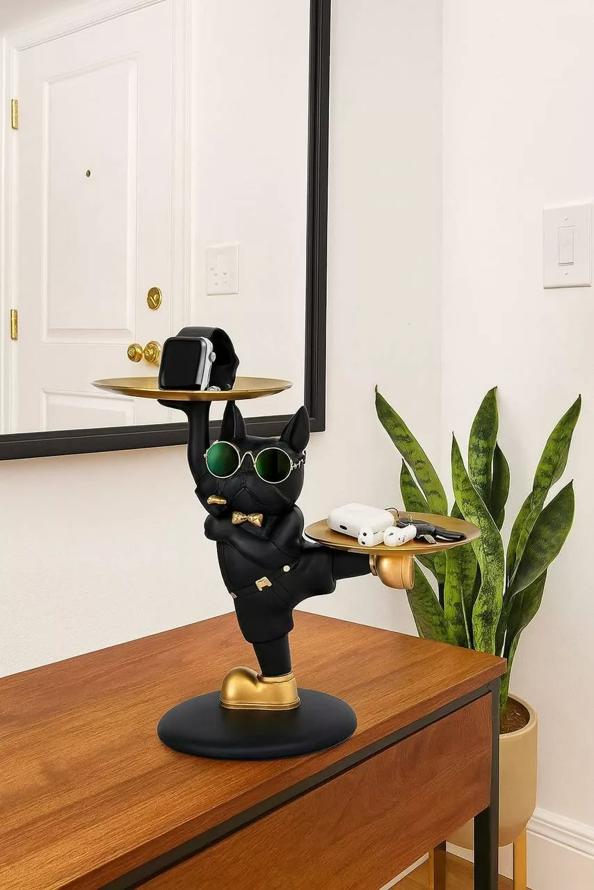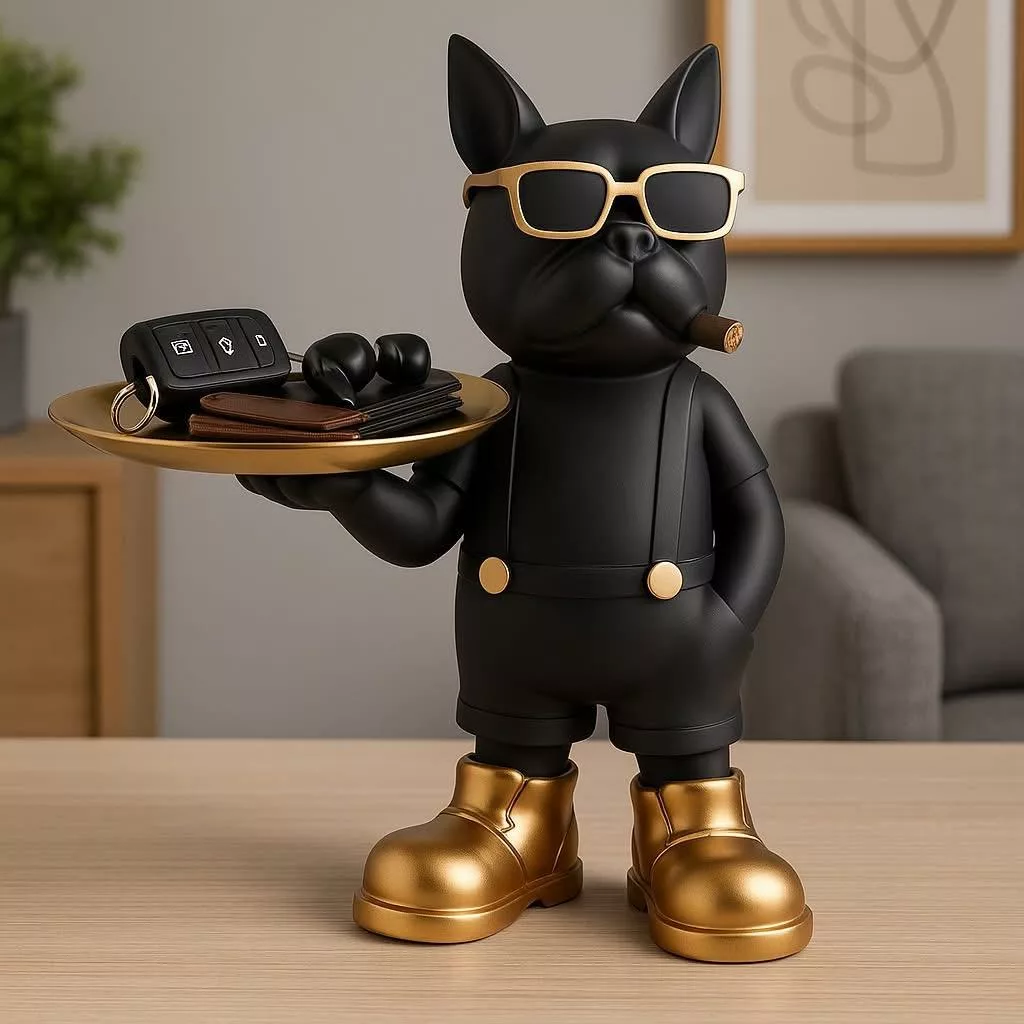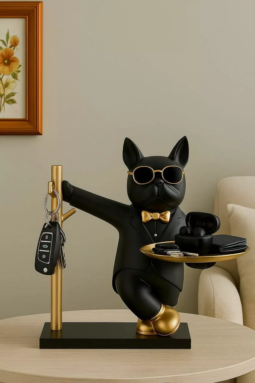Statue Vide-Poche Bouledogue “Le Majordome” – Plateau & Porte-Clés Intégré