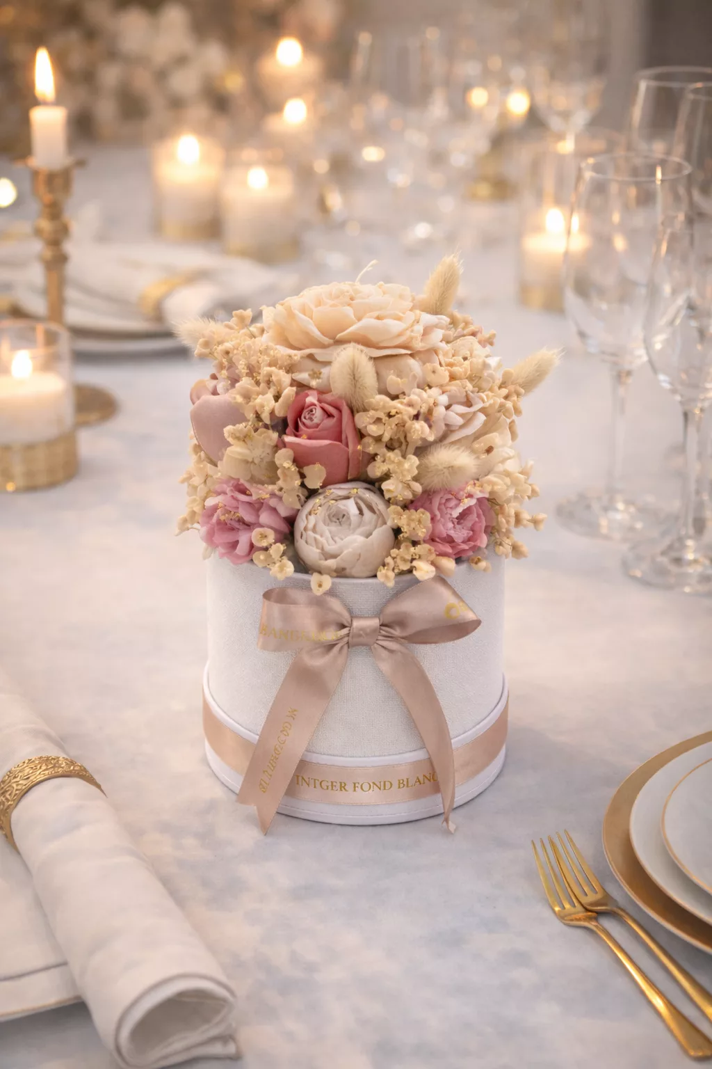 Apportez une touche de raffinement et de douceur à votre intérieur avec ce bouquet floral chic présenté dans une élégante hatbox blanche. Associant des fleurs décoratives aux tons nude et rose poudré, agrémentées de délicates bougies, cette composition crée une ambiance chaleureuse et sophistiquée.