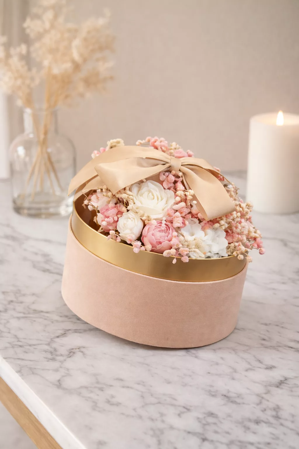 Apportez une touche de raffinement et de douceur à votre intérieur avec cette box de bougies florale Rose & Or, conçue comme un véritable objet décoratif. Son design délicat, associant des tons rose poudré et doré, en fait un cadeau élégant et intemporel, idéal pour toutes les occasions.