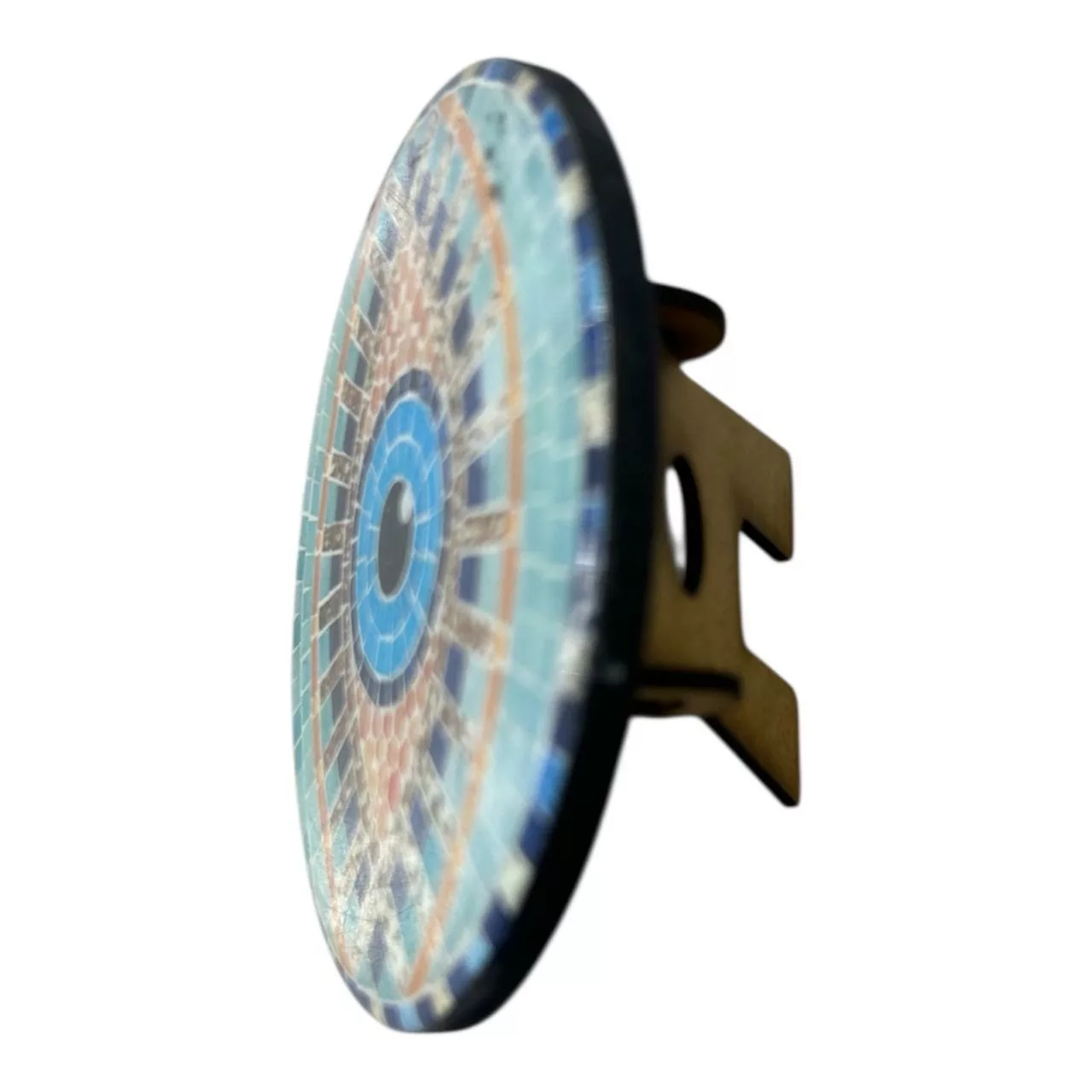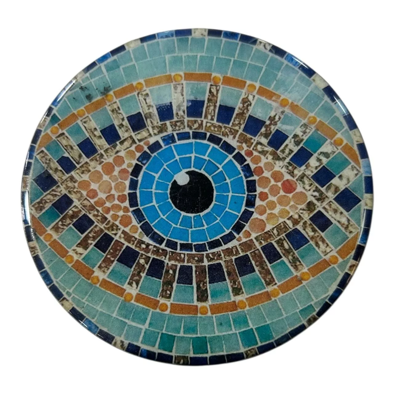 Un disque œil mosaïque en céramique bleue et turquoise, motif protecteur emblématique contre le mauvais œil, réalisé à la main selon la technique de l’émail brillant.