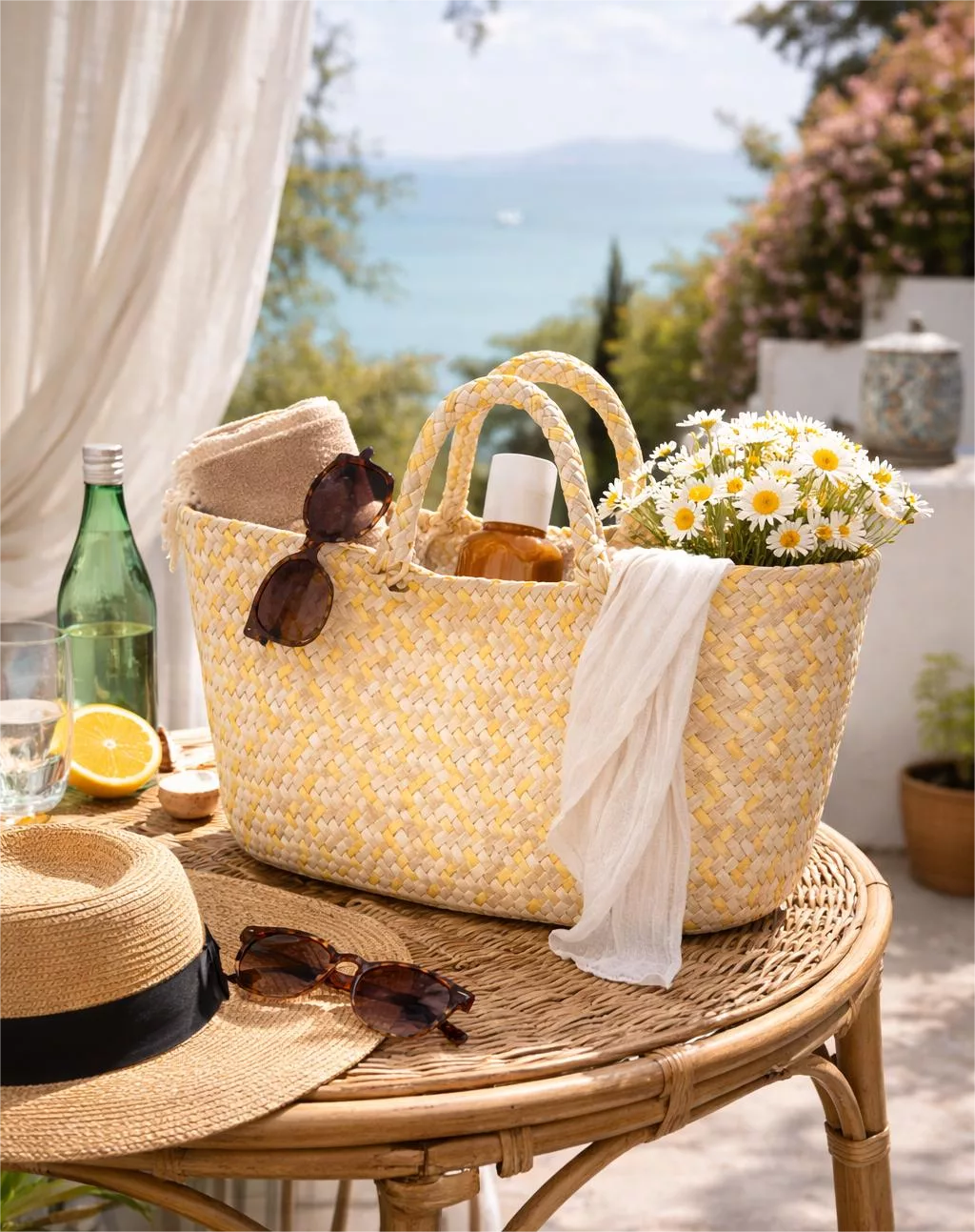 Couffin artisanal en fibres tressées, léger et résistant, idéal pour vos sorties. Son design bohème beige et jaune apporte une touche naturelle et élégante à votre style.