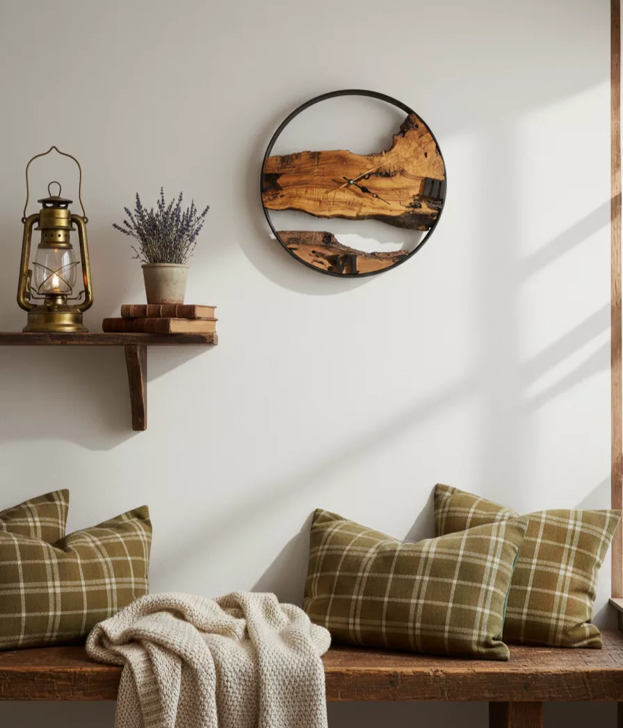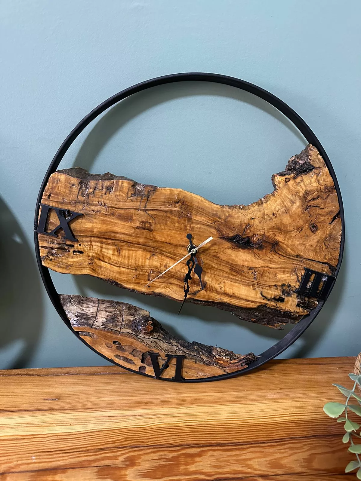 Horloge murale artisanale en bois massif et métal noir, au design naturel et contemporain. Chaque pièce est unique grâce aux veines du bois, apportant une touche authentique, chaleureuse et élégante à tout intérieur, du style rustique au moderne chic.
