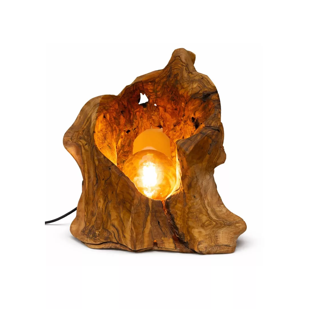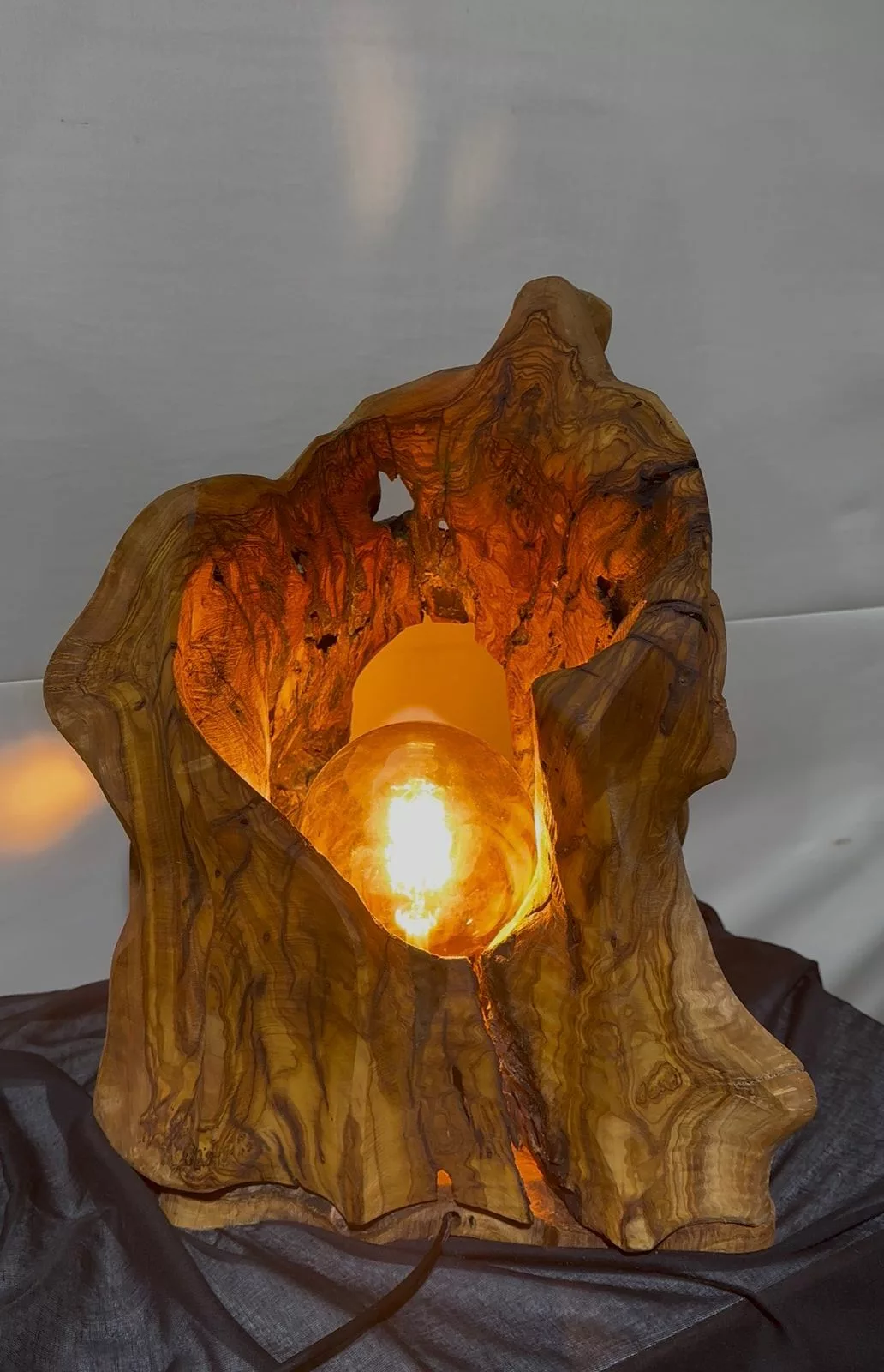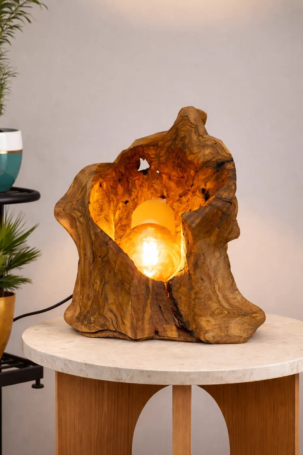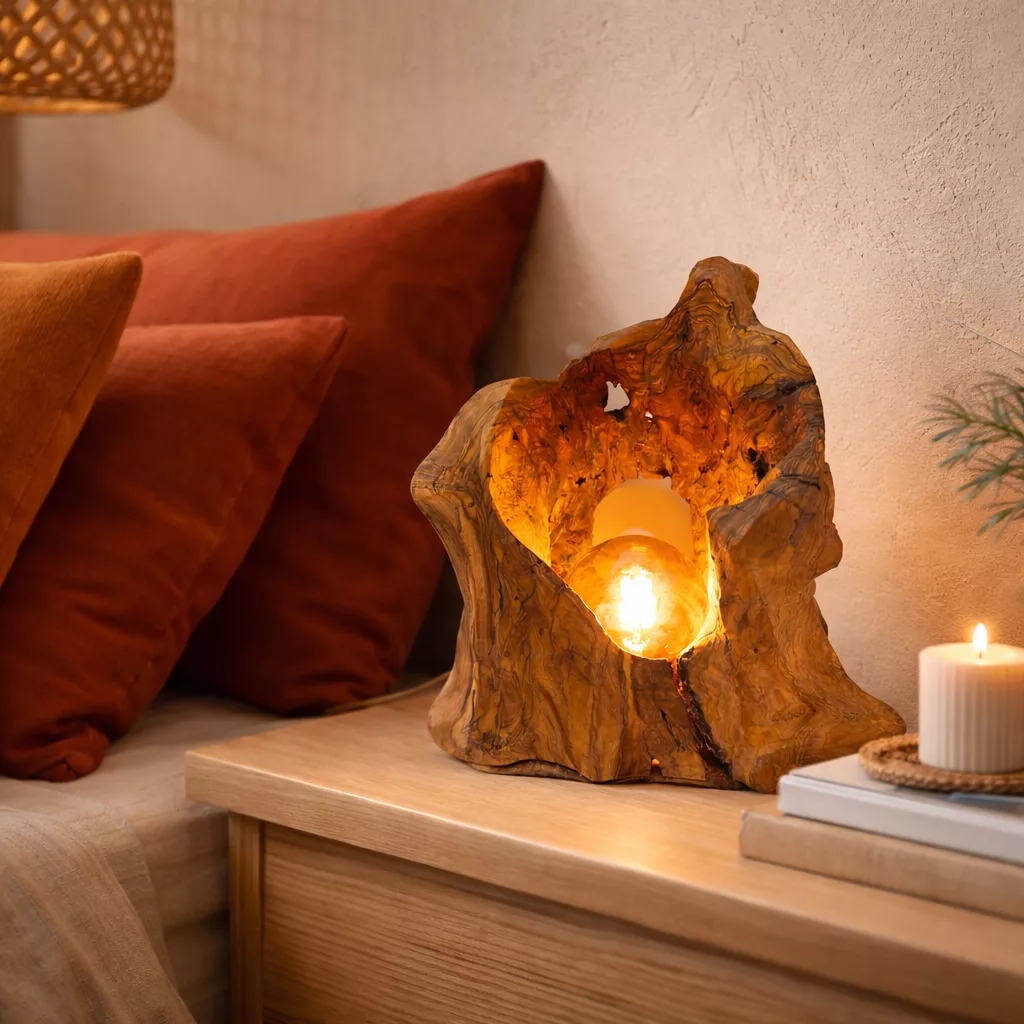 Lampe Artisanale en Bois d’Olivier – Pièce Unique Lumineuse Naturelle “Oliva Glow”