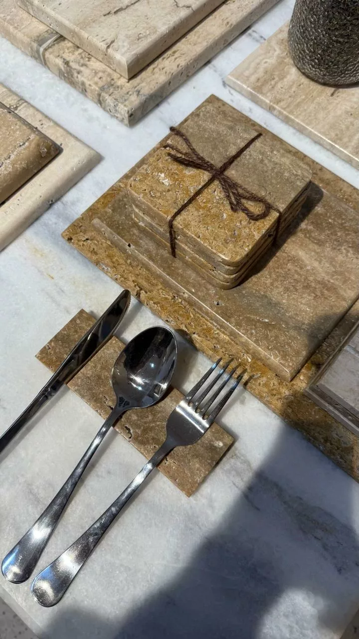 1 planche en travertin 25 x 30 cm : Grande et polyvalente, idéale comme plateau de présentation ou planche de découpe.