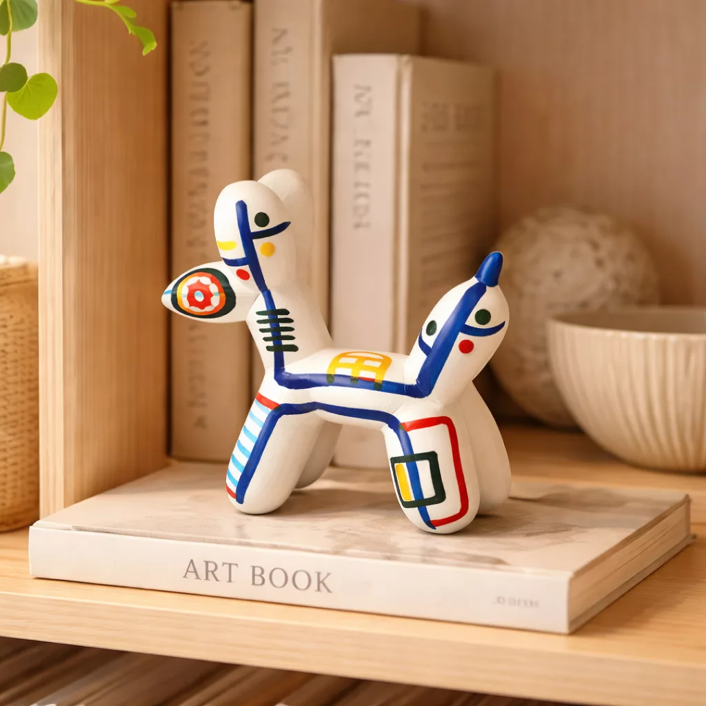 Objet décoratif en forme de chien en céramique émaillée, au design artistique et coloré, idéal pour apporter une touche originale et moderne à votre intérieur.