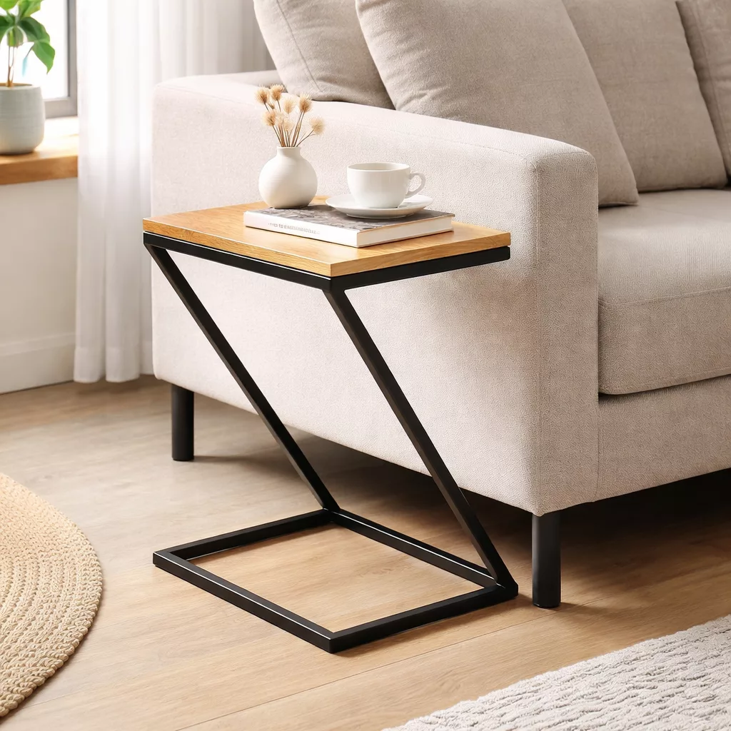 Table d’appoint au design contemporain, caractérisée par un piètement en métal noir formant un Z et un plateau rectangulaire en bois massif.
