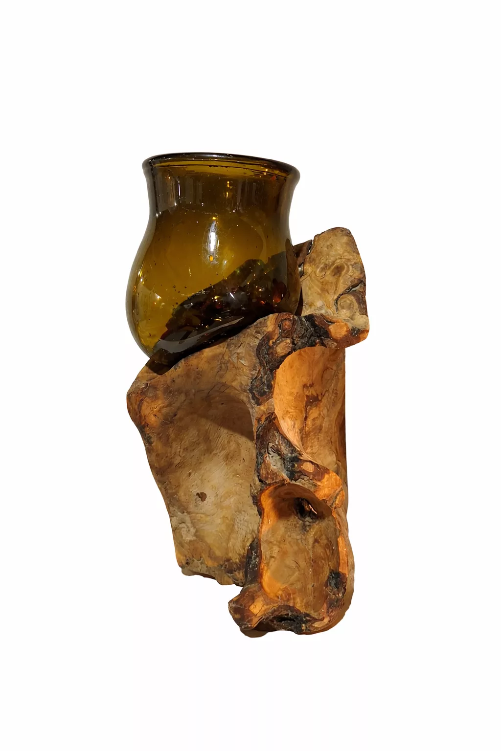 Vase artisanal en bois d’olivier & verre ambré – Pièce unique